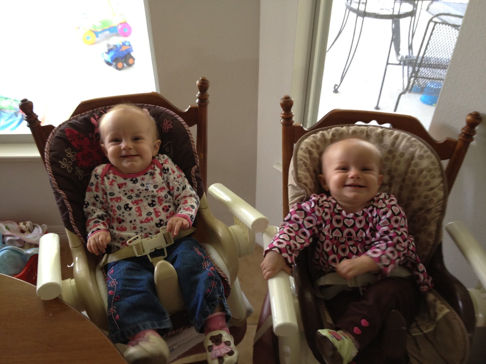 Right now Devon's favorite game to play with his sisters is still "huggin' the babies", where he bestows affection on one and then the other before he gets a little too aggressive and I have to pull him off. His second favorite game is to wait for them to pick up a toy, scream "Mine!", grab the toy, and put it on the rocking chair where they can't reach it. All three seem to think this is wildly funny. They do it over and over, resulting in a precarious pile of toys on the rocking chair. One of these days, I predict that my assertive Melina will realize the unfairness in this game and haul off and sock Devon. That'll be interesting.
