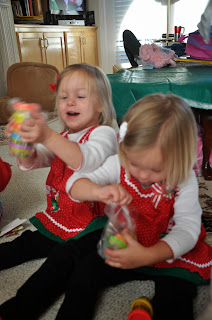 The surprise hit was several little containers of playdoh.  Thankfully, they just wanted to stack them and didn't seem to excited to open them.